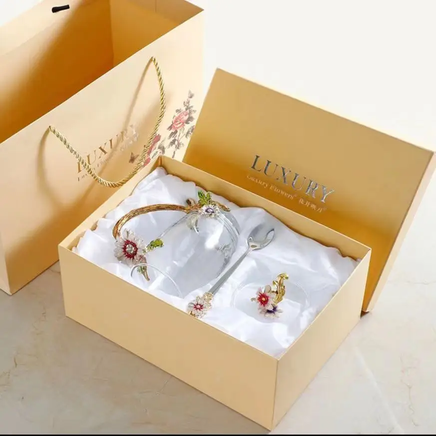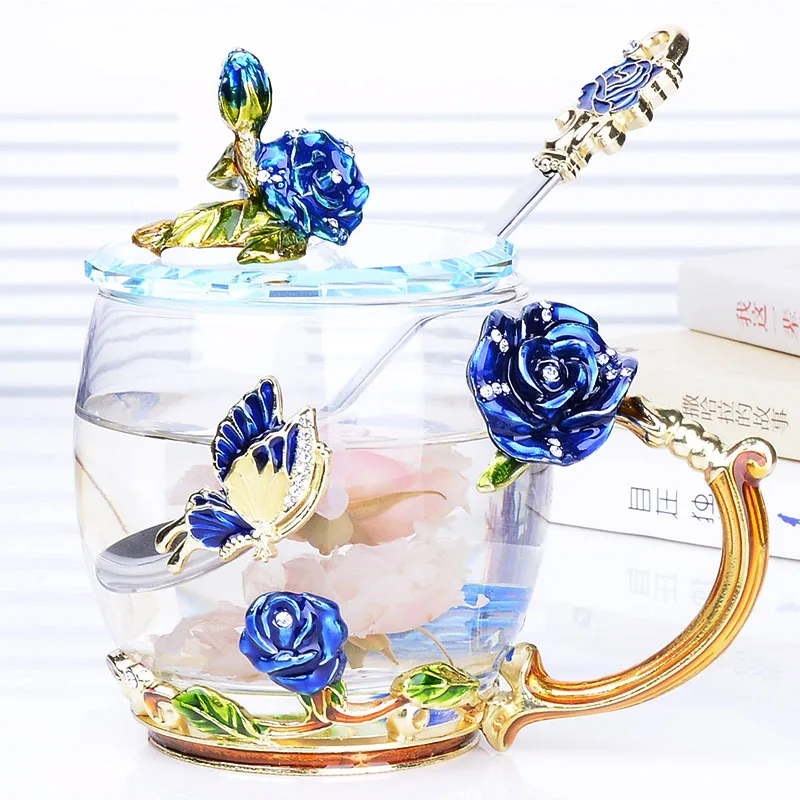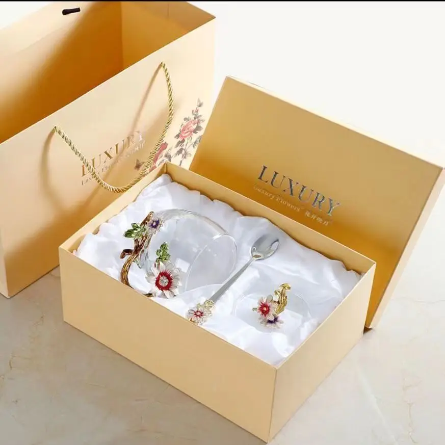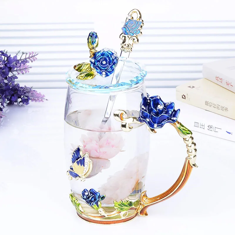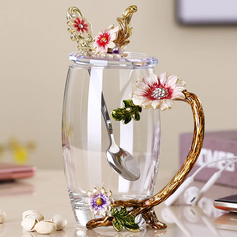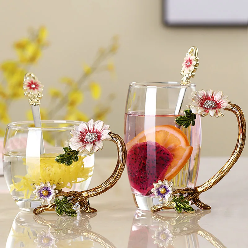 Coffee Tea Mugs High grade Enamel Transparent Glass Mug Red flower Heat-Resistant Cup Set with Stainless Steel Spoon Coaster