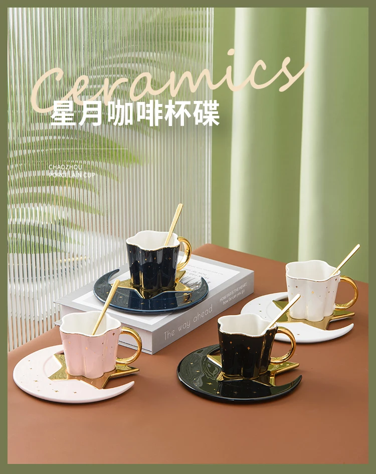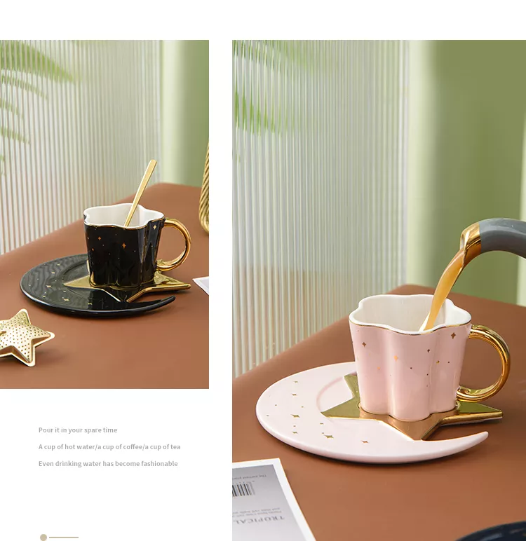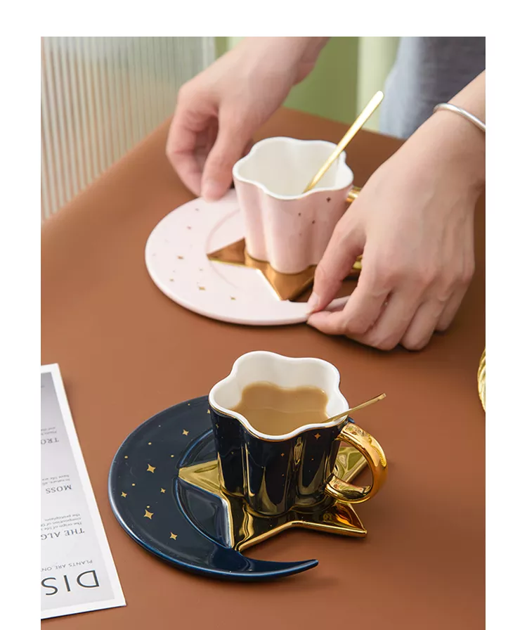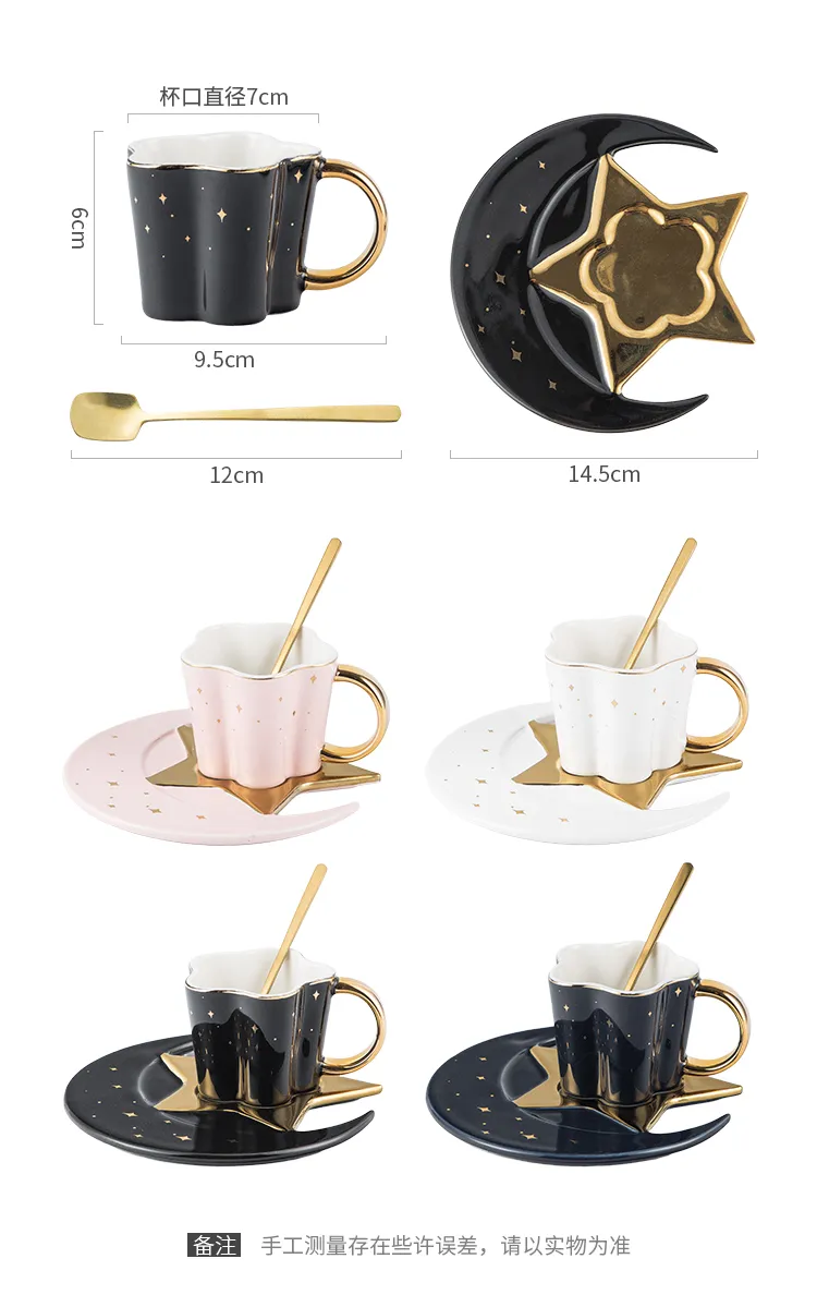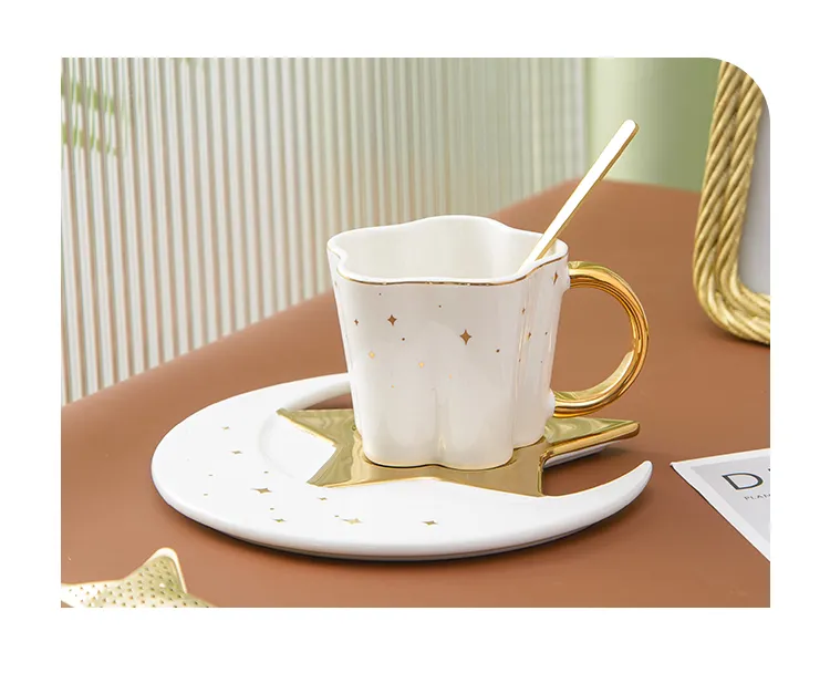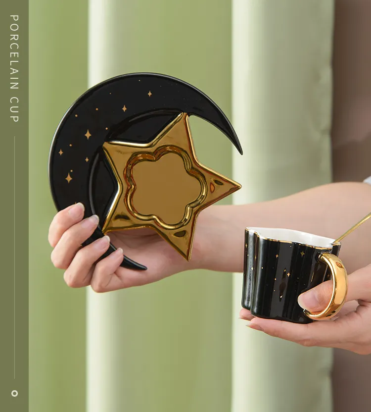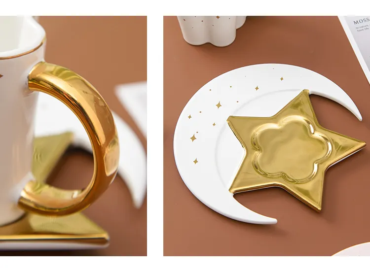 Creative Ceramic Star Moon Coffee Cup And Saucer With Spoon Golden Handle Mug Afternoon Tea Cup Juice Water Drinks Cup Porcelain