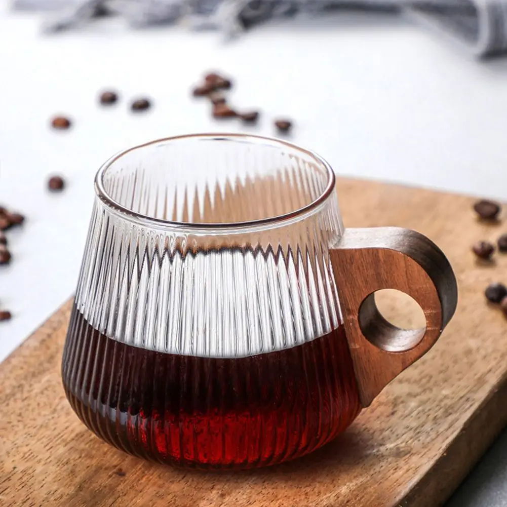 Vertical Stripes Tea Milk Cup Glass Coffee Mug Japanese-Style Glass Cup with Wooden Handle Home Office Drinkware Beer Mug Gift